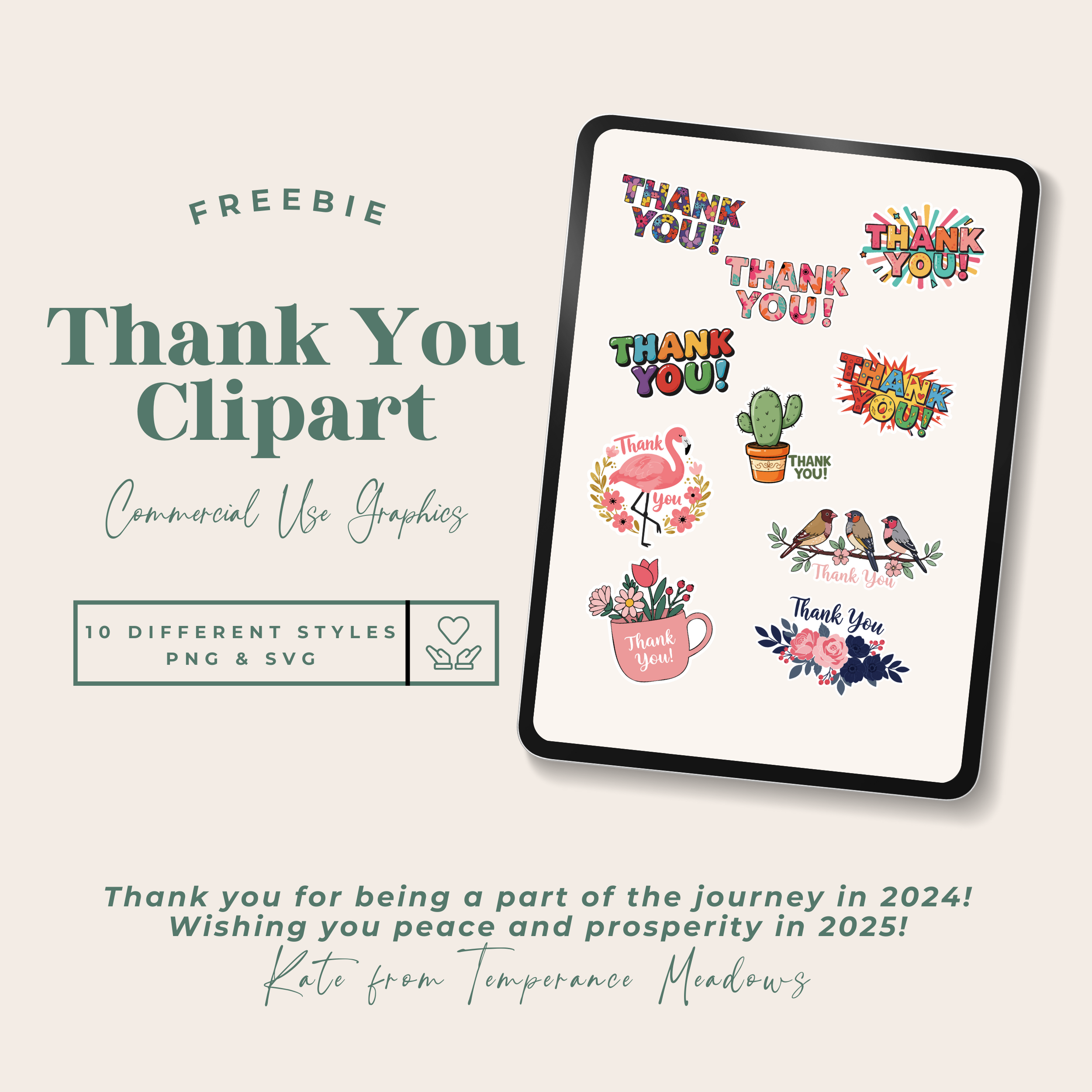 I have one last little freebie for you this month. I made a set of 10 “thank you” cliparts for you to use in your endeavors (personal or commercial). It’s just my way of saying thanks for coming along for the ride. There are high quality PNGs, sticker-style versions, and I’ve also included the SVGs in case you like that sort of thing. Just click the image to grab the clipart!