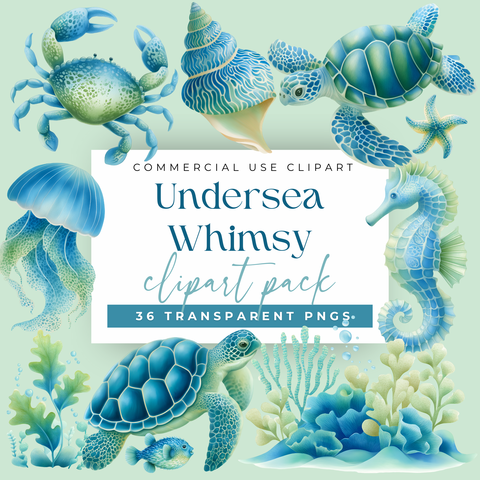 This month, I've got a brand-new watercolor clipart pack to add a splash of charm to your next project: Undersea Whimsy! It's filled with 36 transparent PNGs, including turtles (of course!), plus jellyfish, crabs, coral, seaweed, and more, all in calm, coastal colors that work beautifully for baby showers, birthday invites, nursery prints, and summery designs.