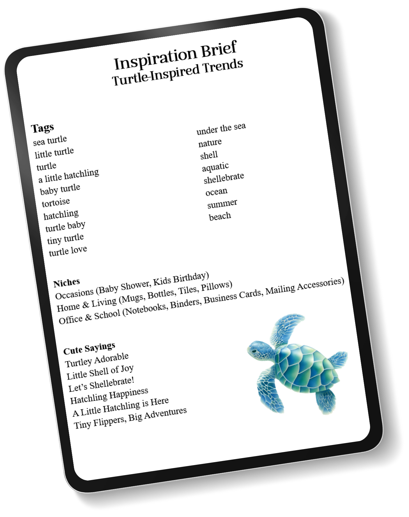 Our first Inspiration Brief is turtle-themed (of course! π ). You'll find trending tags (like "sea turtle," "hatchling," and "turtle love"), top-selling product niches for this aesthetic, and sweet, pun-friendly sayings like "Turtley Adorable" and "Let's Shell-ebrate!" You can grab the clipart and the brief together, then mix, match, and start designing, slow and steady style (just watch out for cars! π ).